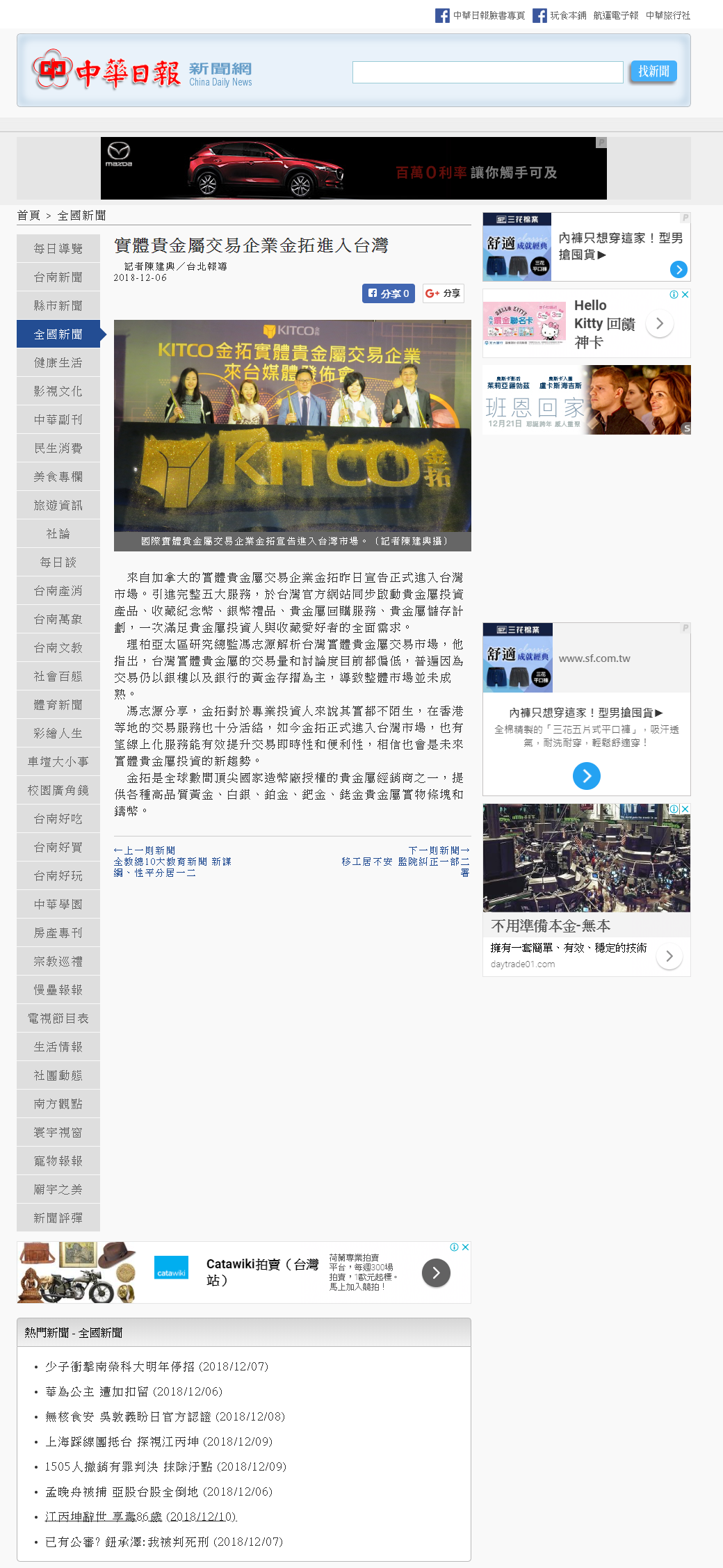 中華日報(網絡)_實體貴金屬交易企業金拓進入台灣 06/12/2018
