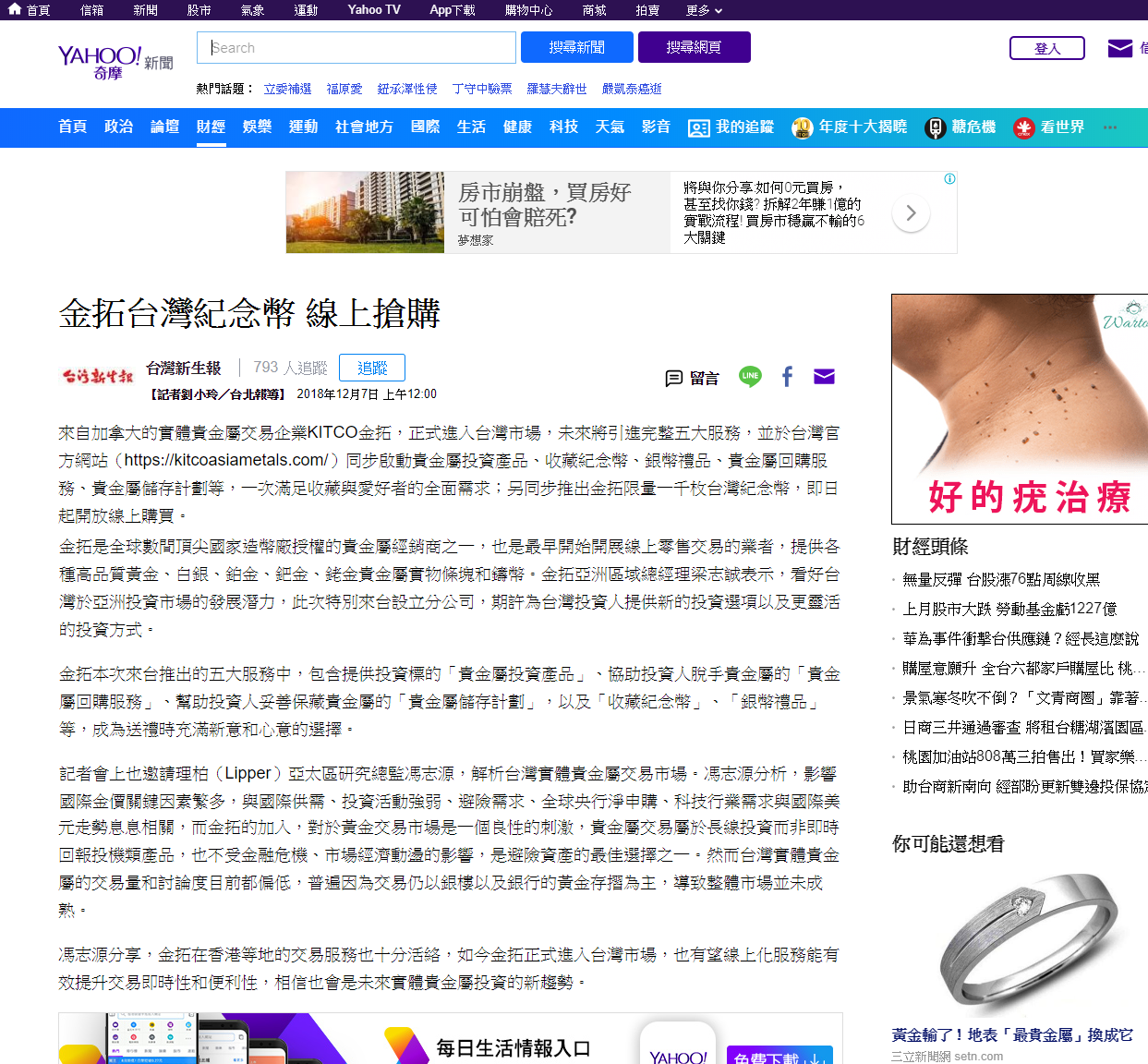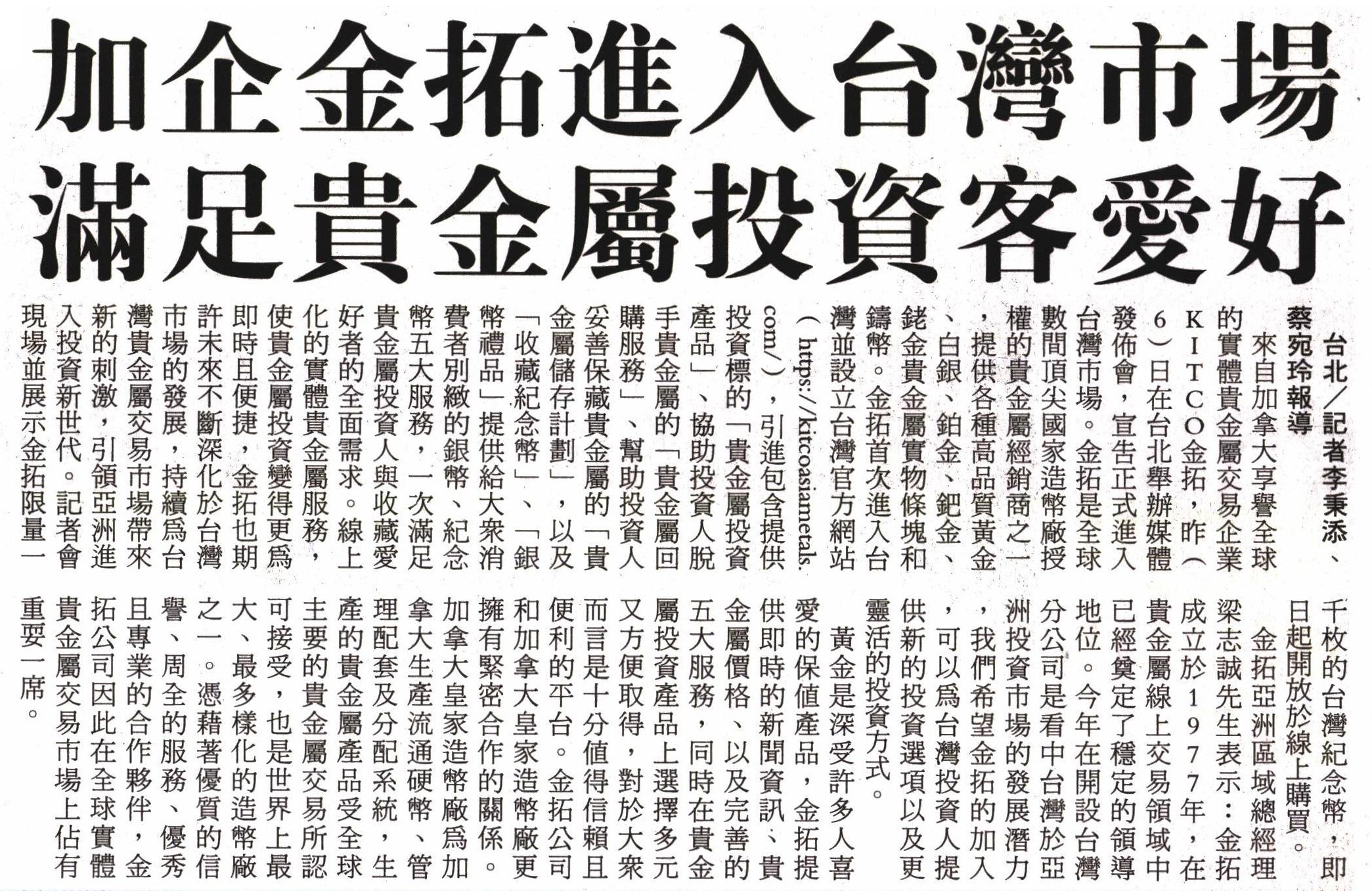 Kitco’s Launch in Taiwan_台灣新生報(Online) 07/12/2018