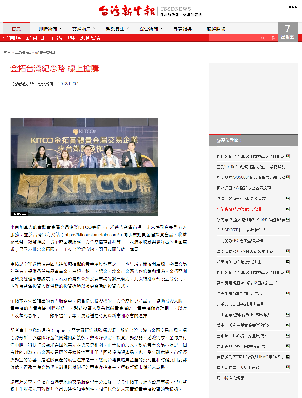 Kitco’s Launch in Taiwan_台灣新生報(Online)